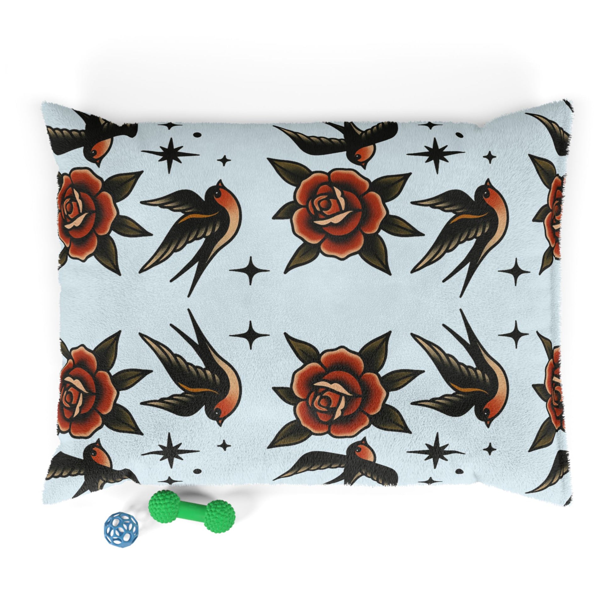 This unique pet bed features a traditional tattoo flash design with swallowS. It provides a cozy and stylish resting place for your furry friend, adding a touch of edgy flair to your home decor. Perfect for pet owners who appreciate unique and eye-catching designs, this pet bed is ideal for celebrating a fur baby birthday or adding a bold statement piece to any room.