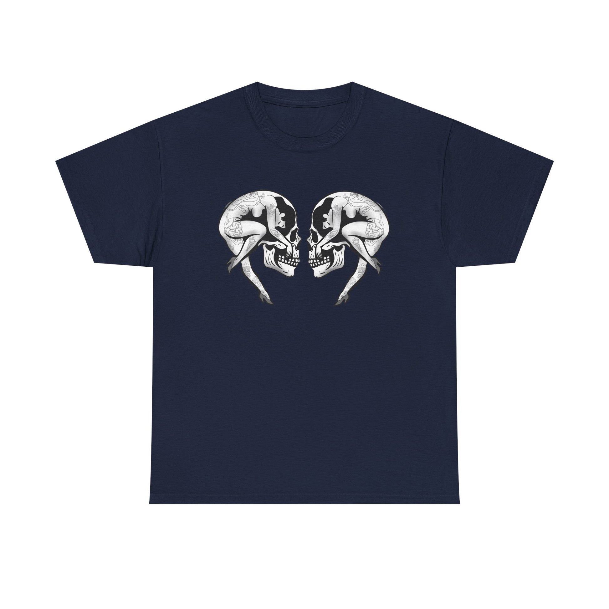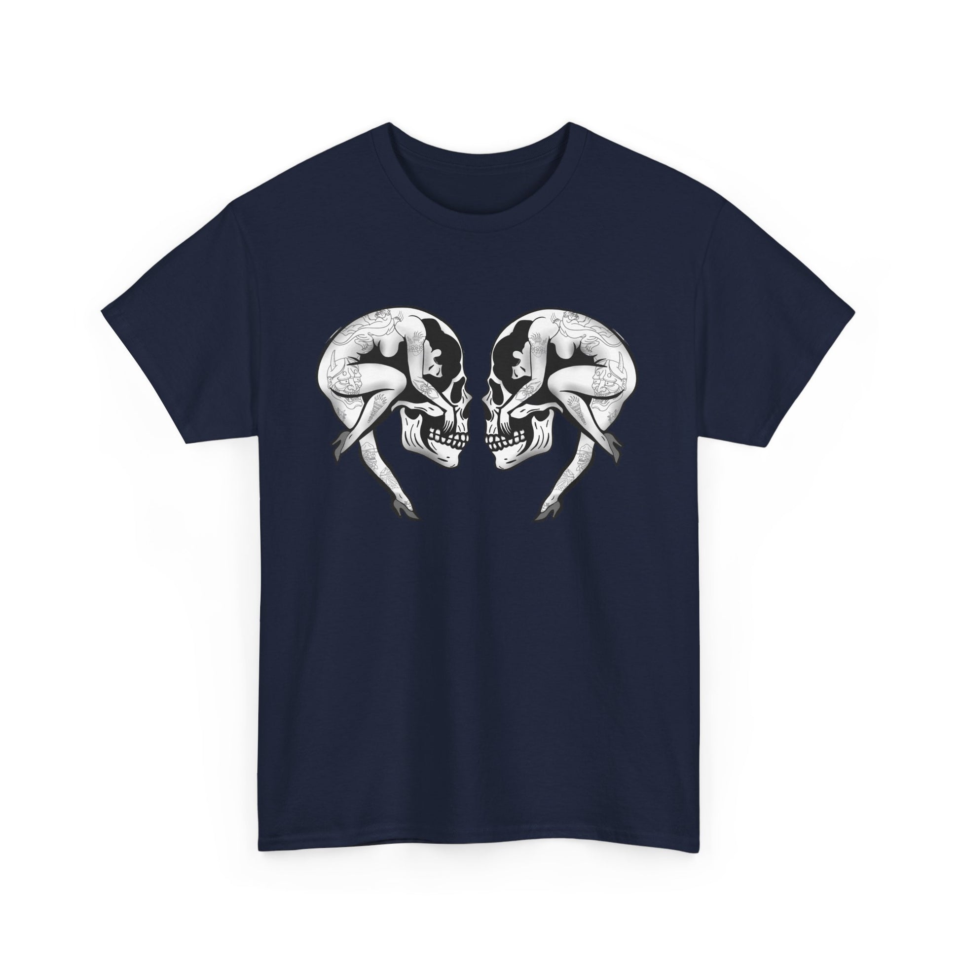 A traditional tattoo-style design featuring two tattooed female nudes mirrored in the shape of a skull, giving off a bold and edgy vibe. This unisex heavy cotton tee is perfect for alternative fashion enthusiasts and tattoo lovers. Ideal for occasions like music festivals, tattoo conventions, and casual outings.