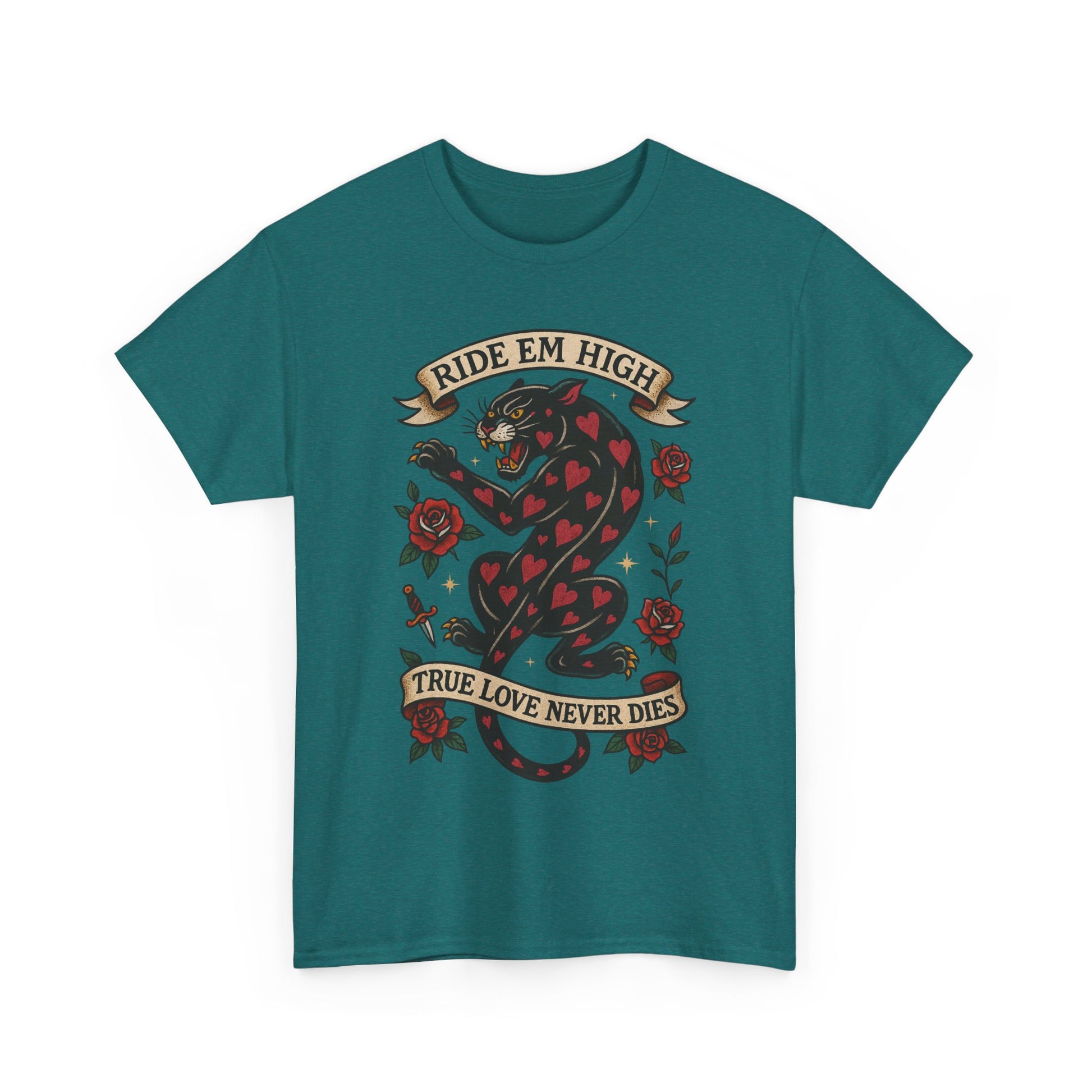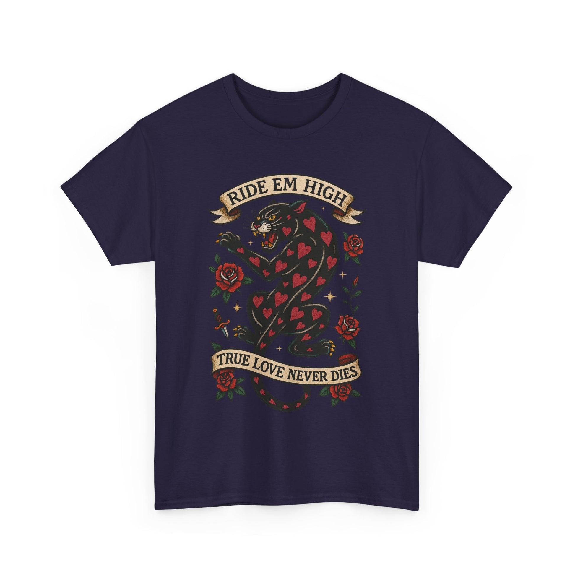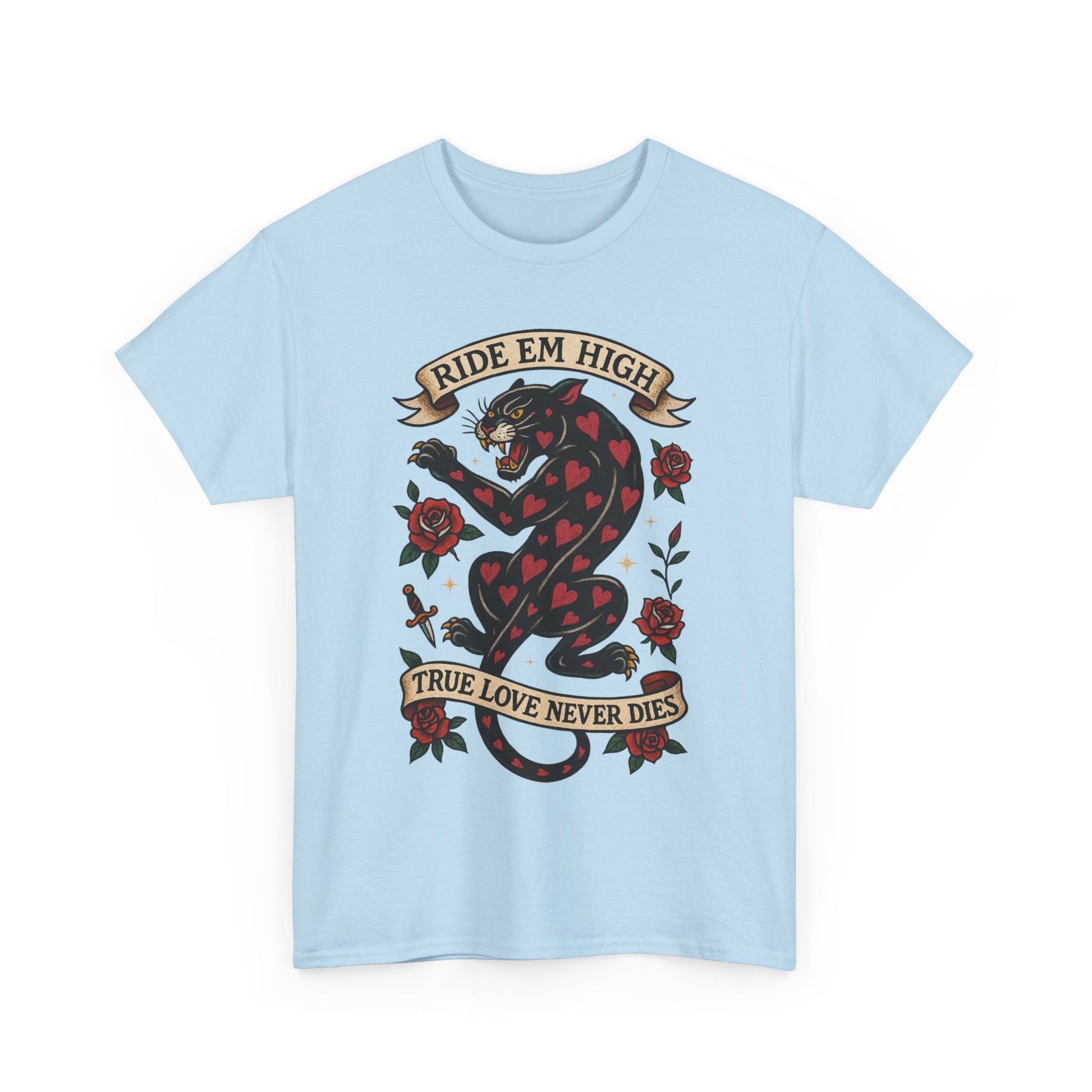 This Traditional Crawling Panther with Hearts tee exudes a classic and timeless vibe, perfect for those who appreciate vintage-inspired designs. It can be worn casually or dressed up for special occasions. Ideal for adults, this tee is perfect for occasions like Valentine's Day, birthdays, or everyday wear.