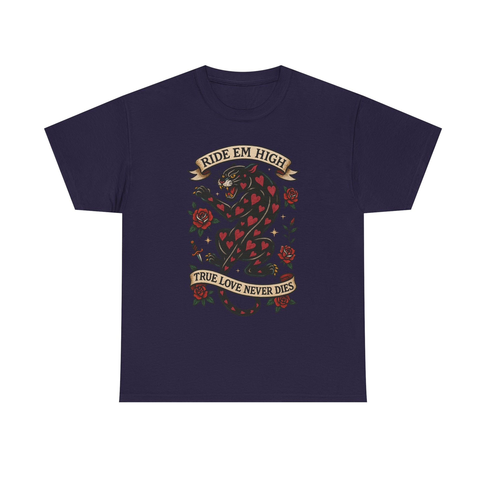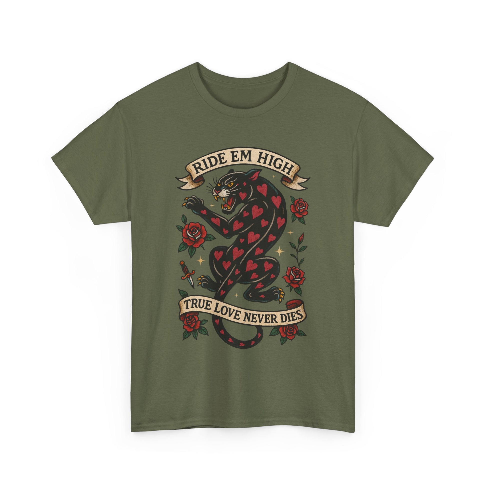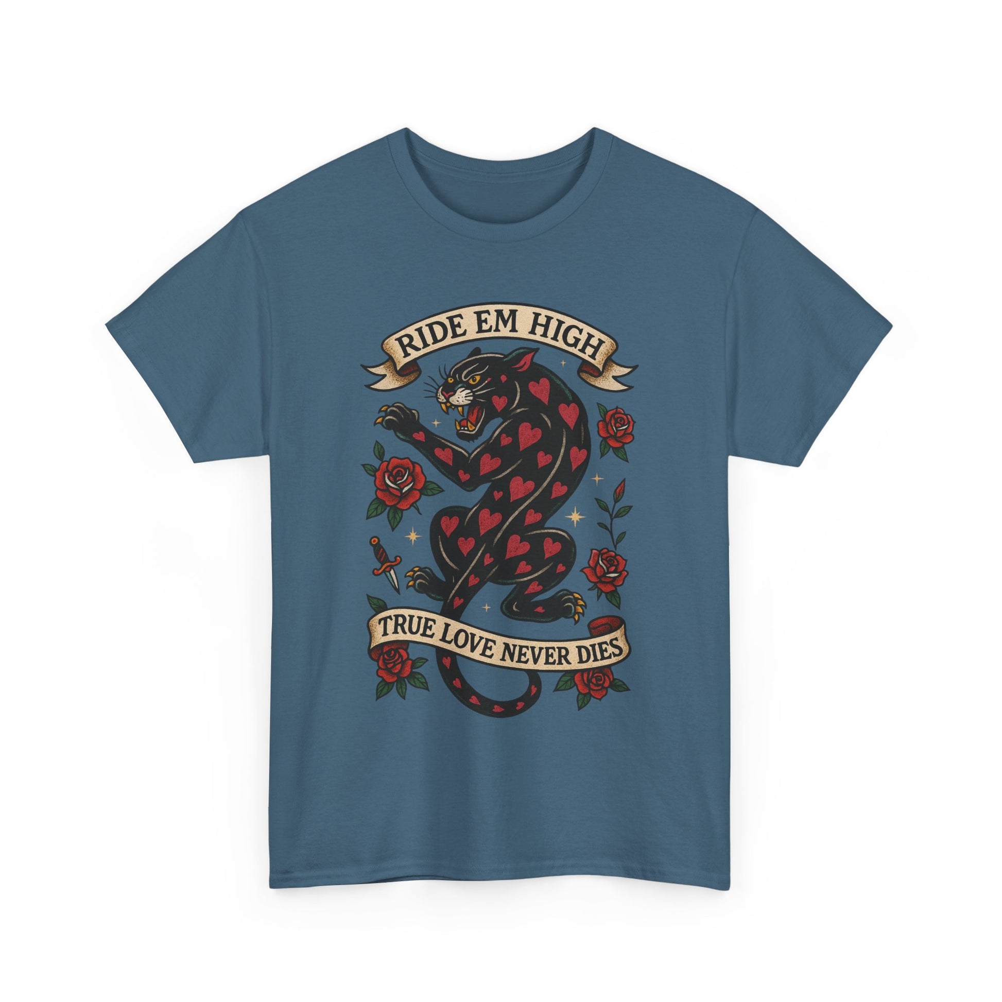 This Traditional Crawling Panther with Hearts tee exudes a classic and timeless vibe, perfect for those who appreciate vintage-inspired designs. It can be worn casually or dressed up for special occasions. Ideal for adults, this tee is perfect for occasions like Valentine's Day, birthdays, or everyday wear.