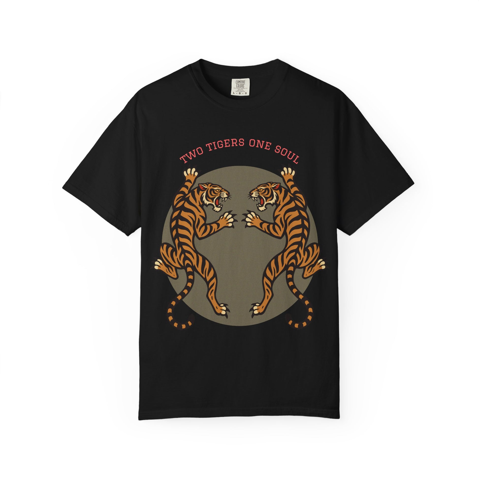 A vintage feel unisex garment-dyed t-shirt featuring a traditional crawling tiger tattoo design with two mirrored crawling tigers facing each other. This bold and retro t-shirt is not for the faint-hearted, perfect for those looking to make a statement with their outfit. Ideal for individuals who love unique and edgy designs. Relevant for events like tattoo expos, rock concerts, and casual outings.